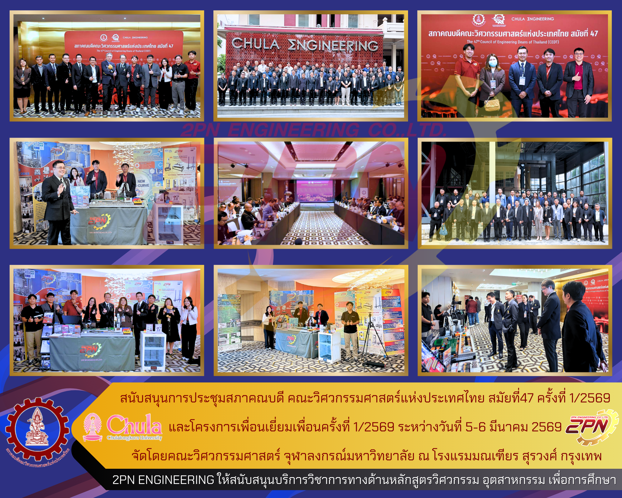 2PN ENGINEERING ได้เข้าร่วมและสนับสนุนการประชุมสภาคณบดี คณะวิศวกรรมศาสตร์แห่งประเทศไทย สมัยที่47 ครั้งที่ 1/2569 และโครงการเพื่อนเยี่ยมเพื่อน ครั้งที่ 1/2569 ระหว่างวันที่ 5-6 มีนาคม 2569 จัดโดยคณะวิศวกรรมศาสตร์ จุฬาลงกรณ์มหาวิทยาลัย ณ โรงแรมมณเฑียร สุรวงศ์ กรุงเทพฯ เพื่อส่งเสริมทางด้านวิชาการการศึกษา ส่งเสริมเทคโนโลยี และนำเสนอนวัตกรรมของอุตสาหกรรมใหม่ๆ เพื่อผลักดันเข้าสู่ภาคการศึกษาต่อไป